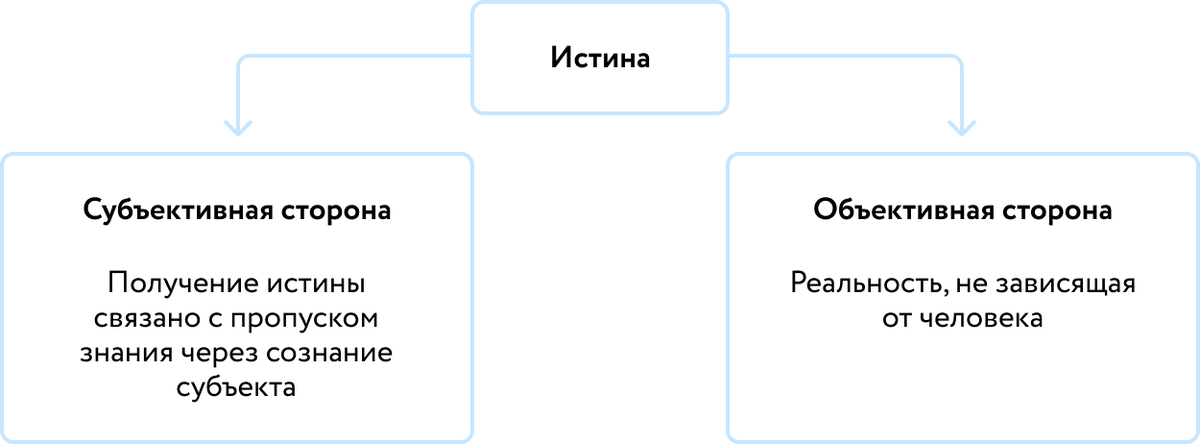 Получается, истина соединяет в себе субъективную и объективную стороны, что и обуславливает такие её свойства, как конкретность и объективность соответственно.