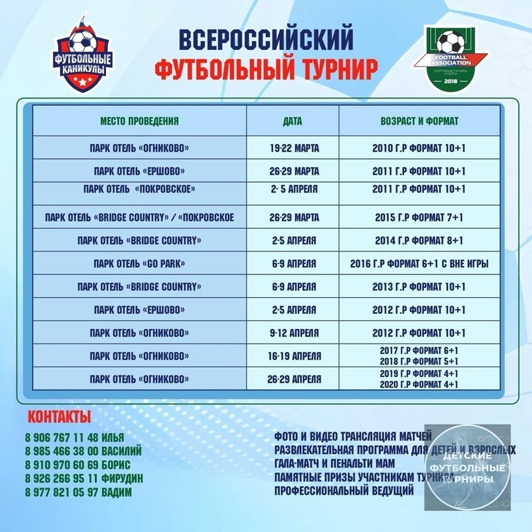 ! ‼️Мы чуть изменили сроки и места проведения турниров среди команд 2012 и 2016 года рождения, а так же сделали дополнительный турнир для 2011 года рождения! 🚀🔥Остались последние места Успейте принять участия в Всероссийских футбольных турнирах, среди детско-юношеских команд (Весна 2026⚽️) 🏆🥇🥈🥉Кубки, медали, индивидуальные призы каждой команде. 🎵 Музыкальный Квиз для родителей 🥅Конкурс пенальти Мам 🧠Детский футбольный Квиз ⚽️Гала Матч Тренеры - Родители 🎥 Онлайн трансляция всех матчей --- #ФутбольныйТурнирМарт2026 #ФутбольныйТурнирАпрель2026 #ФутбольныйТурнирМосковскаяОбласть2026 #ФутбольныйТурнирМосковскаяОбласть2010гр #ФутбольныйТурнирМосковскаяОбласть2011гр #ФутбольныйТурнирМосковскаяОбласть2012гр #ФутбольныйТурнирМосковскаяОбласть2013гр #ФутбольныйТурнирМосковскаяОбласть2014гр #ФутбольныйТурнирМосковскаяОбласть2015гр #ФутбольныйТурнирМосковскаяОбласть2016гр #ФутбольныйТурнирМосковскаяОбласть2017гр #ФутбольныйТурнирМосковскаяОбласть2018гр #ФутбольныйТурнирМосковскаяОблас