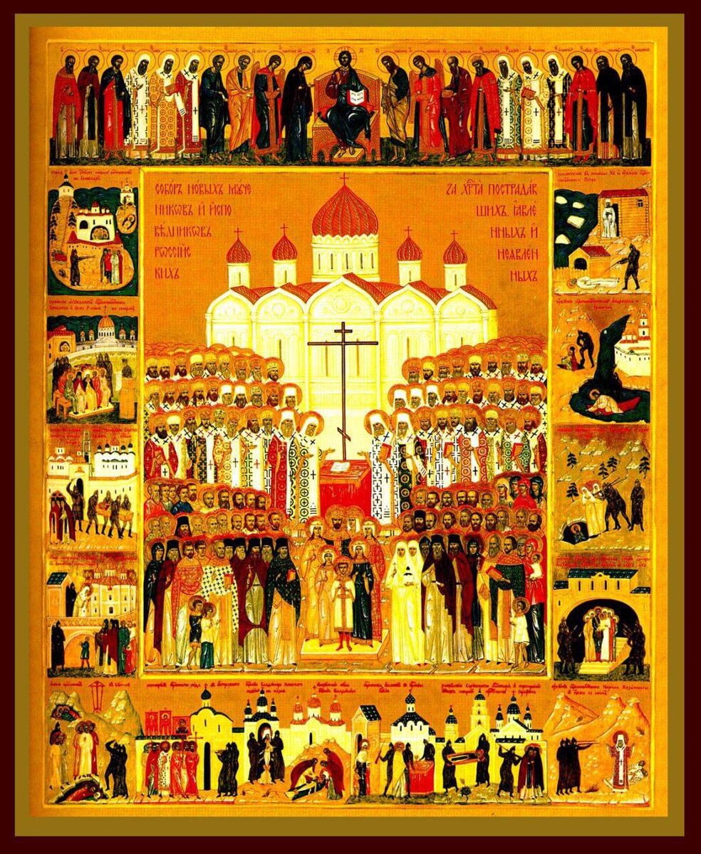 Днесь ра́достно лику́ет Це́рковь Ру́сская,/ прославля́ющи новому́ченики и испове́дники своя́:/ святи́тели и иере́и,/ ца́рственныя страстоте́рпцы,/ благове́рныя кня́зи и княги́ни,/ преподо́бныя му́жи и жены́/ и вся правосла́вныя христиа́ны,/ во дни гоне́ния безбо́жнаго/ жизнь свою́ за ве́ру во Христа́ положи́вшия/ и кровьми́ и́стину соблю́дшия./ Тех предста́тельством, Долготерпели́ве Го́споди,/ страну́ на́шу в Правосла́вии сохрани́// до сконча́ния ве́ка.