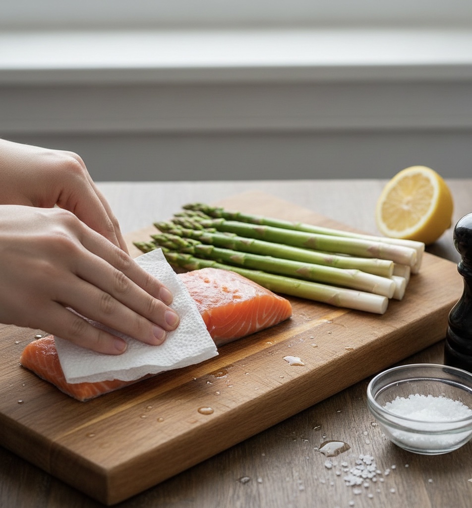 Прежде всего, давайте подготовим основные ингредиенты. Филе лосося хорошо промойте под холодной водой, обсушите бумажными полотенцами. Если есть кожа, можете оставить ее или аккуратно снять. Посолите и поперчите рыбу с обеих сторон. Спаржа также нуждается в небольшой подготовке: отломите жесткие кончики (они сами легко отламываются в нужном месте). Молодую спаржу можно не чистить.