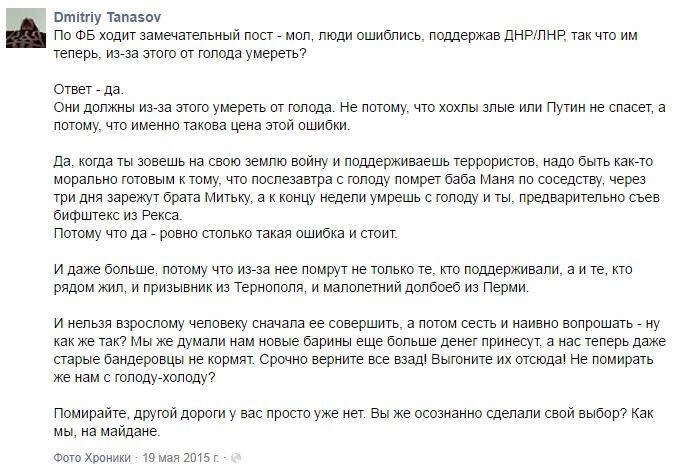 Кстати, очень характерный для многих граждан Украины, активно «воюющих в интернетах». Это они злорадствовали по поводу отключения электричества в Крыму. По поводу засухи там же. По поводу отсутствия воды в Донецке. А такие как Гордон вообще советовали дончанам пить мочу. Ну или вот как автор этого сообщения абсолютно осознано желает жителям Донецка умереть от голода, поскольку «они должны отвечать за свой выбор и за свои ошибки». На мой взгляд, можно провести прямую аналогию с нынешним положением дел в замерзающих городах Украины. Я не злорадствую. Но… В чем-то согласен с автором поста от мая 2015 года – каждый должен нести ответственность за свой выбор. Даже если вы не скакали на Майдане. Если вы просто молчали во время АТО, когда снаряды и авиабомбы ВСУ убивали детей Донбасса. У вас все равно был выбор. И я знаю, о чем говорю. А теперь вы все расплачиваетесь за свой выбор. И не надо искать в своих бедах виноватых. Это все последствия ВАШЕГО выбора. @ukr_leaks