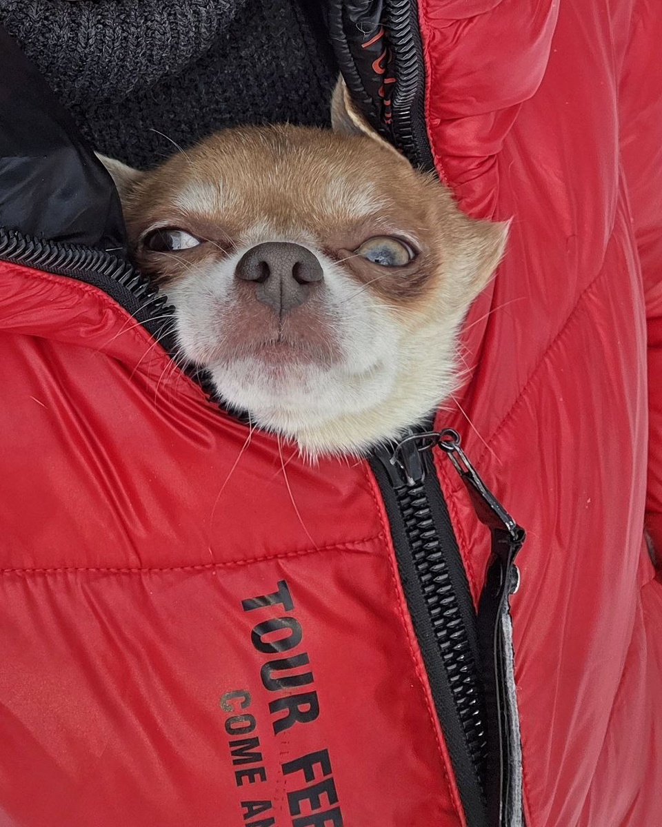 ? Я поверил, помчался на улицу, а там 🥶 Пришлось ма выгуливать меня за пазухой 🥰 Кстати, для зимы у меня это лучший вариант прогулки, теплее, чем в коляске и в сумочке 🔥