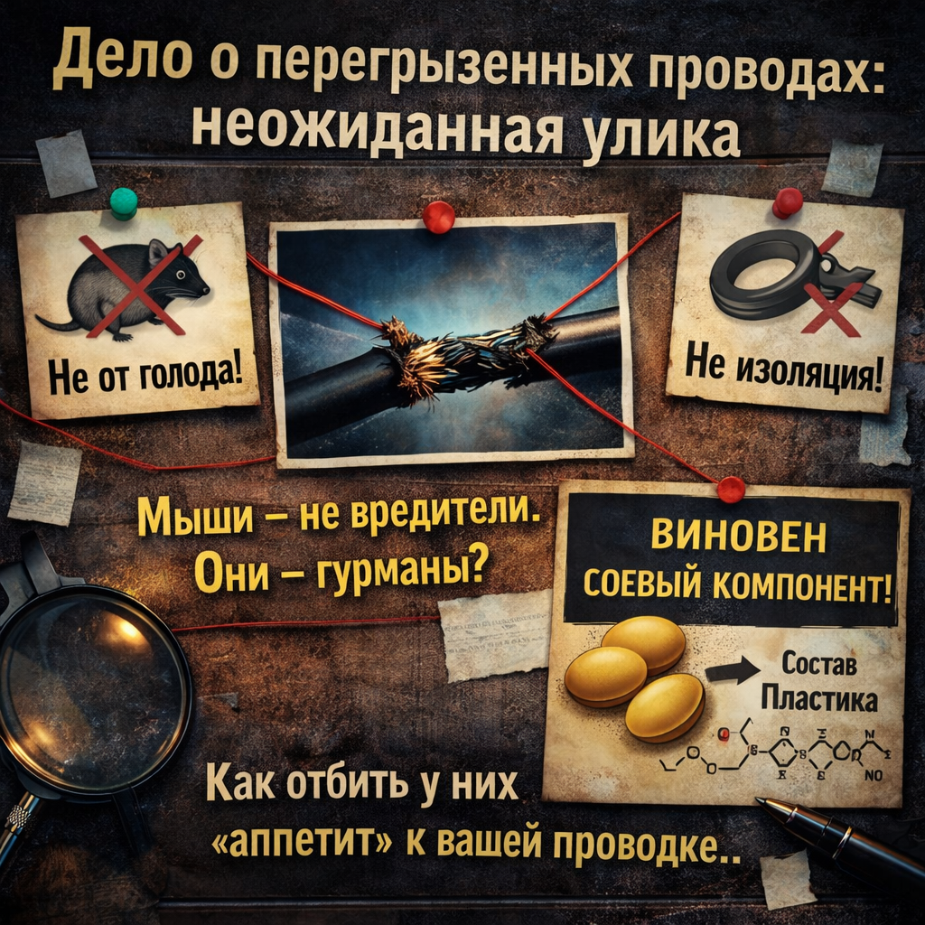 Вы обнаружили обглоданный провод от ноутбука или зарядку 🔌, или проводку в автомобиле 🚗. Классическое объяснение: «Мыши голодные, точат зубы». Вы меняете кабель на новый, дорогой, «защищённый от грызунов». А через месяц история повторяется… 😩 Стоп. Вы лечите следствие, а не причину. Правда в том, что голод и необходимость стачивать зубы — лишь малая часть мотивации. Гораздо чаще их ведёт к проводам не инстинкт, а… 🧪 химическая ностальгия. Их привлекает не пластиковая изоляция сама по себе. Их манит запах соевого компонента или арахисового масла 🥜, которые производители всё чаще добавляют в пластификаторы для удешевления и повышения эластичности состава. Современный пластик пахнет для них не техникой. Он пахнет едой . Аппетитной, маслянистой, знакомой. Это всё равно что для вас положить в коробку со шнурами свежеиспечённый пирог . Сигнал «съедобно» перевешивает все остальные соображения. 💡 Что это значит для вас? 📌 Шаг 1. Убрать «ароматную приманку». 📌 Шаг 2. Лишить доступа и