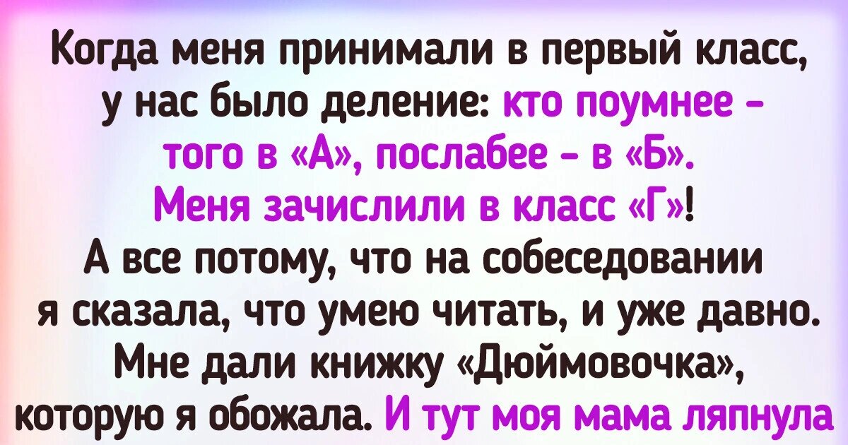 Когда меня принимали в первый класс, у нас было деление: кто поумнее — того в «А», послабее — в «Б». Меня зачислили в класс «Г»! А все потому, что на собеседовании я сказала, что умею читать, и уже давно. Мне дали книжку «Дюймовочка», которую я обожала. И тут моя мама ляпнула: «Да она эту книгу наизусть знает». Я, не открывая книги, начала говорить. Ничего другого прочитать мне не предложили и просто зачислили в класс «Г», где читать не умел никто! Я там умирала от скуки первые полгода. © Ведьма без осла / ADME