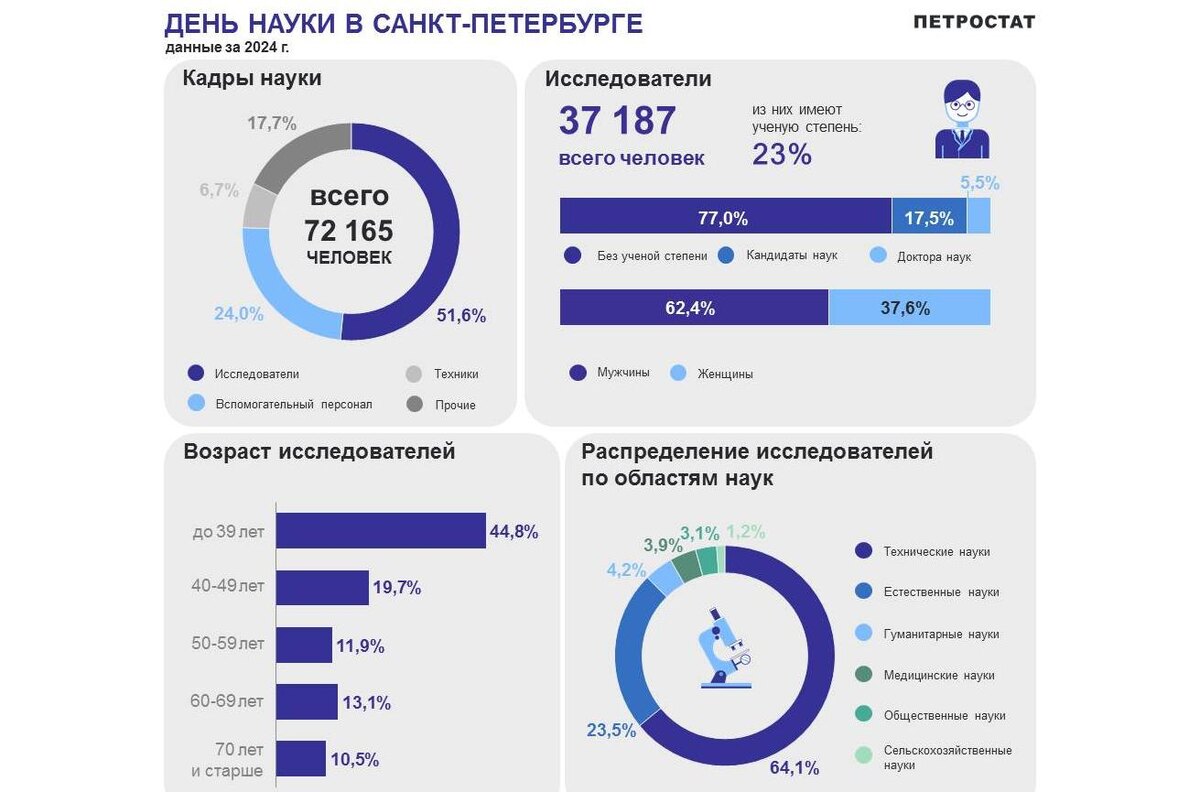 Всего, по данным Петростата, в Петербурге в области науки работает 72 165 человек, из которых 51,6% заняты исследованиями, а 24% – вспомогательный персонал. Из 37 178 ученых 23% имеют степень кандидата наук (17,5%) и доктора (5,5%). Гендерная принадлежность ученых распределилась так: 62,4% ученых – мужчины, 37,6% – женщины. В Северной столице высокий процент молодых ученых, которым еще не исполнилось 39 лет: они составляют 44,8% всех ученых города. Ученых в возрасте от 40 до 49 лет в Петербурге 19,7%. Больше всего – 64,1% – ученых, занимающихся техническими науками, 23,5% – естественными. Примерно одинаково количество ученых в области гуманитарных и медицинских наук: 4,2% и 3,9% соответственно. В 2024 году на научные исследования было потрачено 1,9 млн рублей, из которых 93,2% приходится на текущие затраты, а 6,8% – на капитальные. Из них на внутренние текущие затраты было направлено 1,8 млн рублей, из которых 69% – на разработки, 17,5% – на прикладные исследования и 13,5% – на фундаме