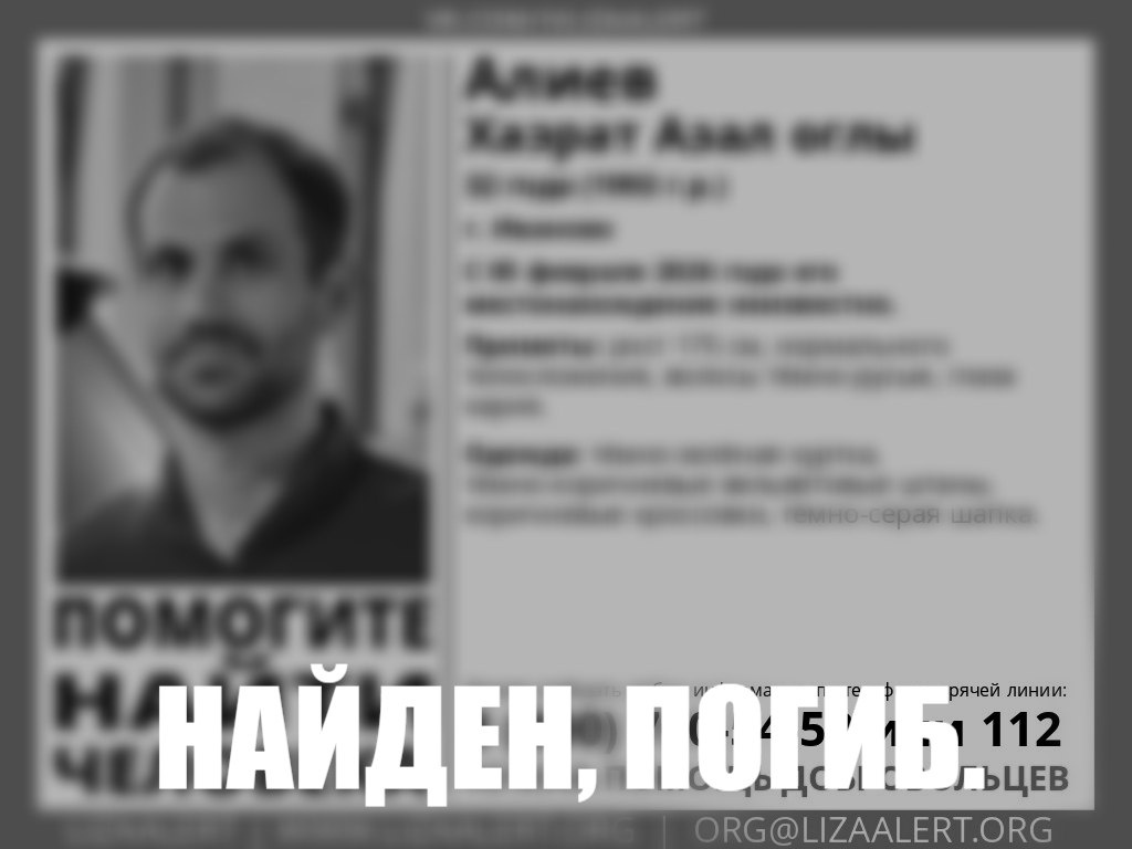 5 февраля в Иванове пропал 32-летний Алиев Хазрат Азал оглы. 6 февраля к поискам мужчины подключились добровольцы отряда «ЛизаАлерт». На следующий день в группе поисковиков сообщили: «Найден, погиб. Выражаем соболезнования родным и близким». Об обстоятельствах пропажи и гибели Хазрата Алиева не сообщается.