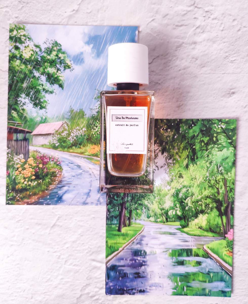Посвященный затерянному в Тихом океане японскому острову он пахнет при этом не только солёными волнами во время шторма, гладкими прибрежными валунами, галькой и размытыми тропинками. Une Ile Pluvieuse пахнет также и даже в большей степени дождем в лесу с его ручьями в тенистых оврагах, зелёной влагой деревьев и травы, терпкой корой, промоченной до самой мантии землёй, чвакающими островками белого мха и переизбытком озона.