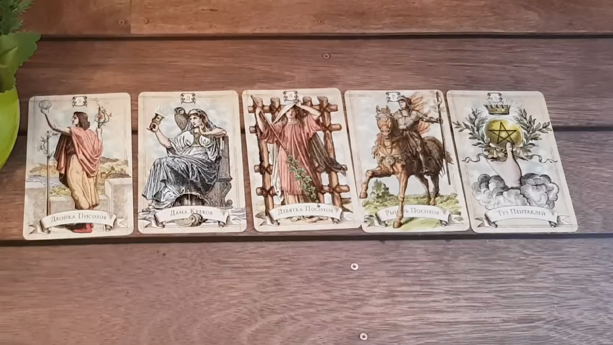 Давайте ещё посмотрим, что карты скажут о вас. Девчонки, вы уже держите в руках какой-то шанс: либо накопили денежки на что-то, либо получили крупную сумму, либо вам сделали неожиданный подарок — настоящий подарок судьбы. И вы уже планируете, чем себя побаловать. Посмотрите, какая девушка красивая! У вас есть резервы, у вас есть средства — и это очень хорошо. Кубковая дама довольна, да ещё и с деньгами в кармане. Девчонки, вам остаётся только позавидовать, потому что, по большому счёту, всё хорошо. За исключением одной карты. Так, давайте, конечно же, смотреть мужчину. Каким вы его представляли? Каким вы видели загаданного человека? Сначала посмотрим энергию ваших отношений — не обязательно прошлых, а саму энергетику. И вот он — Рыцарь Жезлов. Похоже, он стучится, не отпускает вас, что-то пишет и пишет без конца. Но между вами — Дама Жезлов. Вот она, пожалуйста: треугольник. Он в этом треугольнике стоит, и здесь чётко показана двойка Пентаклей — есть ещё какая-то женщина. Так что энергия ваших отношений — это ветер, свист в ушах, обещания, которые уносятся прочь.
