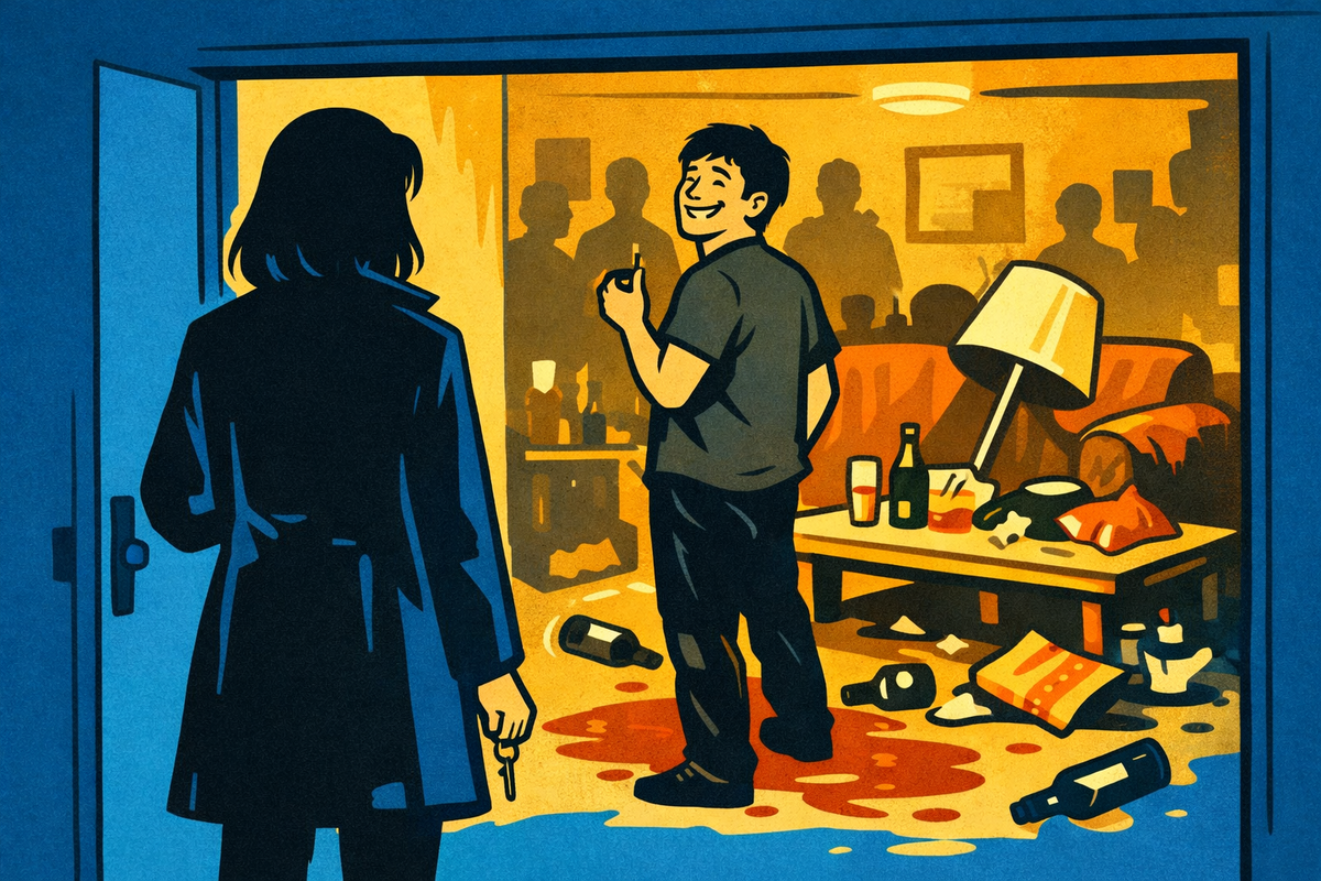 Гостиная, которую я так любовно обставляла, подбирая каждый оттенок подушек и каждый постер на стене, была превращена в подобие заброшенного бара после драки. На диване, застеленном марокканским пледом, сидели трое незнакомых парней. Один из них, лысый и массивный, положил ноги в грязных кроссовках на мой журнальный столик из светлого дуба, на поверхности которого уже красовались кольца от стаканов и глубокие царапины. Бутылки, банки, пакеты от чипсов были раскиданы повсюду. По полу, словно кровавый след, растеклось красное вино — не мое ли, то самое, что я берегла на особый случай? Осколки разбитой вазы, подаренной лучшей подругой, поблескивали в свете торшера, который теперь стоял под странным, неестественным углом.