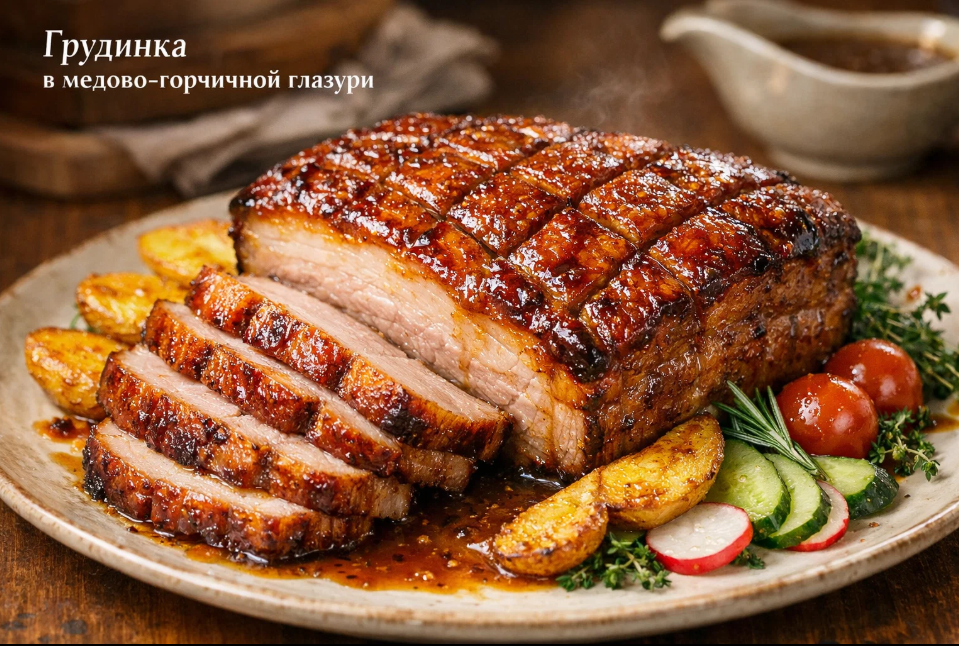 Грудинка универсальна в плане маринадов и глазурей. Она прекрасно впитывает вкусы и ароматы, становясь идеальным холстом для кулинарных экспериментов. Медово-горчичная глазурь в этом смысле классика жанра, проверенная временем комбинация, которая работает безотказно.