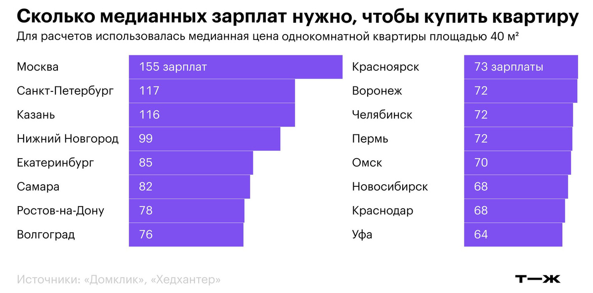 Продолжаем исследовать вопрос удовлетворения такой базовой потребности человека, как жилье. Причем, решения его за деньги: что сейчас -- при капитализме, что в советское время при социализме. Для этого воспользуемся самыми свежими данными о том, сколько нужно средних (медианных) зарплат на покупку 1-комнатной квартиры (на вторичном рынке) в крупных городах России. Средняя цифра по стране оказалось равной 75 месяцам, а так ситуация выглядит по разным городам: От 155 в Москве до 64 месяцев в Уфе. А сколько средних зарплат нужно было, чтобы расплатиться за кооперативную квартиру в СССР 80-х годов? Для этого спросим Алису о ценах за 1, 2 и 3-х комнатные квартиры, построенные в рамках ЖСК (жилищно-строительного кооператива): Получается, что при средней заработной плате в 1985 году равной 199 рублям 1-комнатная квартира обойдется в среднем в 23 зарплаты, 2-комнатная в 38, в трешка в 55. И это новая квартира, а не на вторичном рынке, как в представленном выше расчете. Кстати, если не было ден