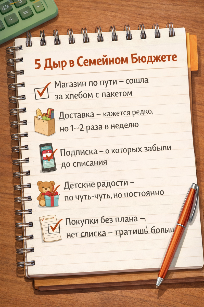 Пока однажды не села и честно не посмотрела, куда деньги уходят каждый день. Вот 5 самых частых «дыр», которые я увидела у себя (и у многих семей): 1. Магазин «по пути»