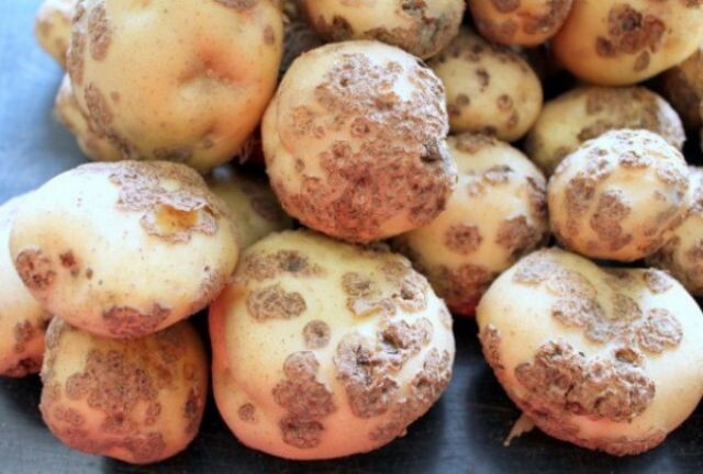 - На молодых клубнях — мелкие, шероховатые, чешуйчатые или бороздчатые пятна.