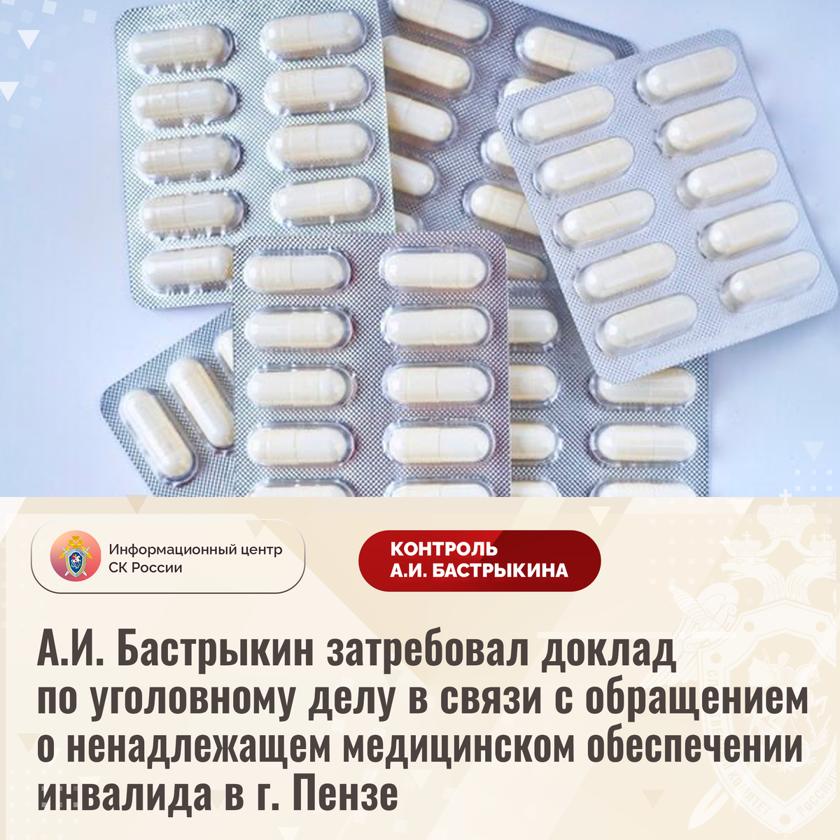 А.И. Бастрыкин затребовал доклад по уголовному делу в связи с обращением о ненадлежащем медицинском обеспечении инвалида в г. Пензе В Информационный центр СК России обратился житель города Пензы по вопросу нарушения его прав на качественное медицинское обеспечение. Мужчина, являющийся инвалидом, нуждается в регулярном приеме лекарственных препаратов. Однако необходимые медикаменты предоставляются заявителю с регулярными задержками. Обращения в профильные структуры результатов не принесли. В СУ СК России по Пензенской области возбуждено уголовное дело. Председатель Следственного комитета Российской Федерации Александр Иванович Бастрыкин затребовал у руководителя СУ СК России по Пензенской области Владимира Викторовича Игнатенкова доклад о ходе и результатах расследования уголовного дела. Исполнение поручения поставлено на контроль в центральном аппарате ведомства. #СледственныйКомитет #СКРоссии #СК #ИЦСКР #ИнформационныйЦентр #АлександрБастрыкин #ПредседательСКР #КонтрольПредседателяСКР