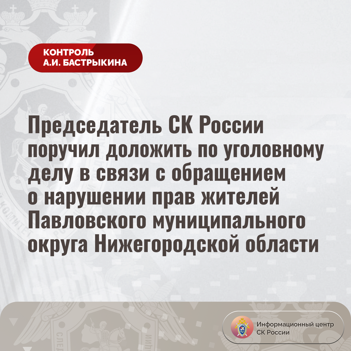 Председатель СК России поручил доложить по уголовному делу в связи с обращением о нарушении прав жителей Павловского муниципального округа Нижегородской области В Информационный центр СК России обратилась жительница Нижегородской области по вопросу нарушения прав жителей деревень Меленки, Крюки и Заплатино Павловского муниципального округа. Поскольку в населенных пунктах отсутствует централизованное водоснабжение, граждане вынуждены использовать технический коммунальный ресурс из местной скважины, который непригоден для потребления и бытовых нужд. Кроме того, длительное время компетентные органы отказывают в строительстве и ремонте дорог, а также газификации деревень Крюки и Заплатино. Многочисленные обращения в различные инстанции результатов не принесли. В СУ СК России по Нижегородской области трижды возбуждались уголовные дела. Павловский городской прокурор Владимир Михайлович Козицын и его заместитель Сергей Васильевич Демин отменили постановления о возбуждении уголовных дел. Обжал