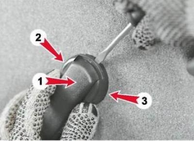 - Далее плоской отверткой или плоским приспособлением вытаскиваем заглушку внутренней ручки двери (поддеваем и выковыриваем). Берем крестовую отвертку и выкручиваем два болта под заглушкой.