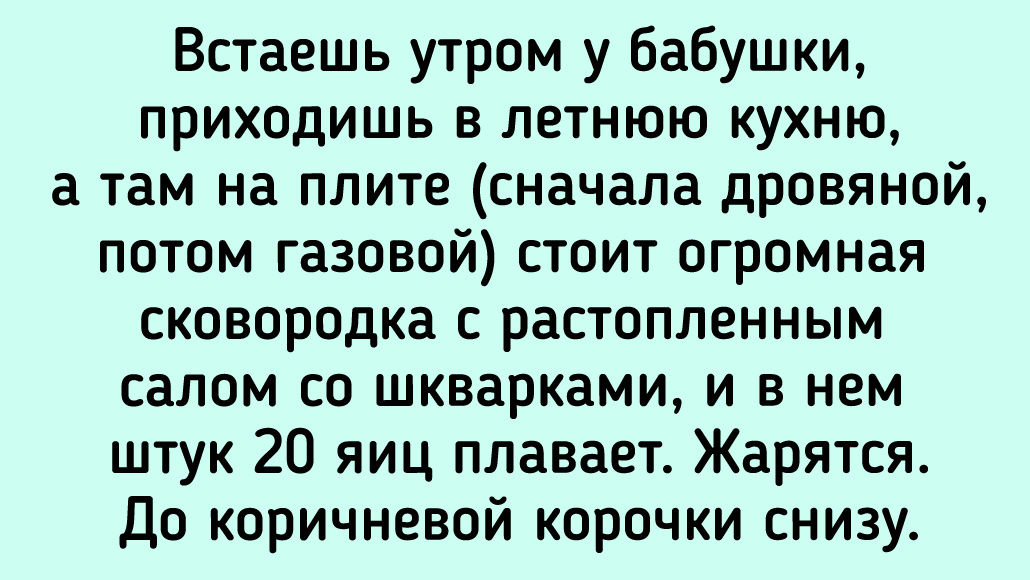 Для меня еда детства (60-е годы) — только, чур, не смеяться — катык с вареной свеклой, мелко порезанной. Бабушка делала в Уфе. На улицу выносили белый хлеб с сахарным песком на подсолнечном масле. Делились все. И еще было пиршество — макароны с жареной колбасой и томатным соусом. Когда я была в 7 классе, вставала очень рано — в 5:30. До школы ехать полтора часа. Плюс пока разденешься, если зима, поднимешься на этаж... Никто меня завтраком не кормил. Спала моя мама. Я ставила на очень медленный огонь жариться 2 яйца, а за это время умывалась и одевалась. И так до 10 класса. Яичницу после окончания школы я не ела на завтрак года 3. © Гузель Маликова / ADME Встаешь утром у бабушки, приходишь в летнюю кухню, а там на плите (сначала дровяной, потом газовой) стоит огромная сковородка с растопленным салом со шкварками, и в нем штук 20 яиц плавает. Жарятся. До коричневой корочки снизу. Хлеб и молоко. © Анжелика / ADME В детстве я ездила в деревню к бабушке. У них было очень большое хозяйство: