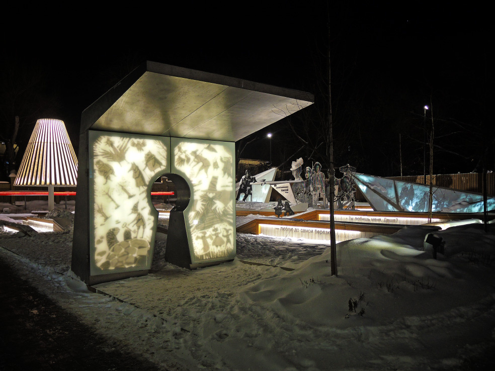 Осенью 2024 года в Самаре было открыто новое пространство. Автостоянку рядом с Литературным музеем на улице Фрунзе превратили в Литературный сквер. Музей находится в усадьбе, в которой в юношеские годы жил Алексей Толстой. Сквер посвятили именно ему и его творчеству. Место получилось многослойным и очень интересным. Дневные прогулки по скверу с подробным обзором я уже показывал, ссылки можно найти в конце статьи. За кадром оставалась вечерняя версия. По анонсам в сети знал, что вечером сквер преображается. Увидеть это преображение собственными глазами смог только в новогодние праздники сезона НГ2026. Это действительно что-то особенное. Помимо просто подсветки различных элементов, полностью по-другому выглядят арка с замочной скважиной и так называемые «кристаллы смысла» - элементы из матового стекла (или пластика) в форме кристаллов или ледовых наростов. На них, благодаря внутренней подсветке, появляются иллюстрации к произведениям Толстого, невидные при дневном свете. Атмосфера в скве