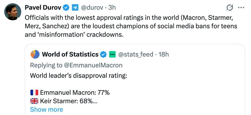собственные рейтинги. «Чиновники с самыми низкими рейтингами одобрения в мире [Макрон, Стармер, Мерц, Санчес] громче всех выступают за запреты соцсетей для подростков и за борьбу с «дезинформацией».» Сальное Дифлопэ