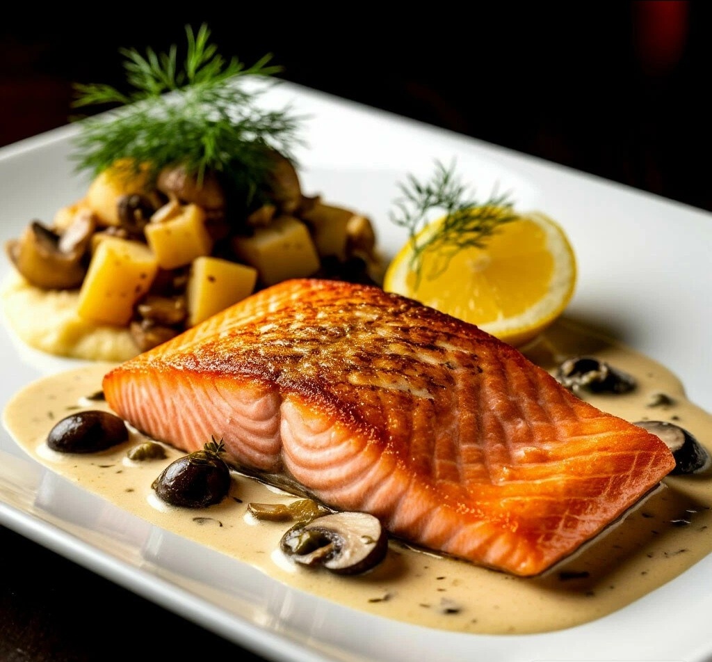 ИНГРЕДИЕНТЫ (на 2 порции): 🧾 ·Филе лосося (с кожей или без) — 2 шт. (около 300 г) 🐟 ·Белое сухое вино — 100 мл 🥂 ·Сливки 20% — 100 мл 🥛 ·Каперсы — 1 ст. л. (можно заменить маринованными огурцами) ·Шампиньоны консервированные (или свежие) — 5-6 шт. 🍄 ·Сливочное масло — 30 г 🧈 ·Соль, свежемолотый белый перец — по вкусу ·Растительное масло — для жарки ·Свежий укроп или петрушка — для подачи 🌿