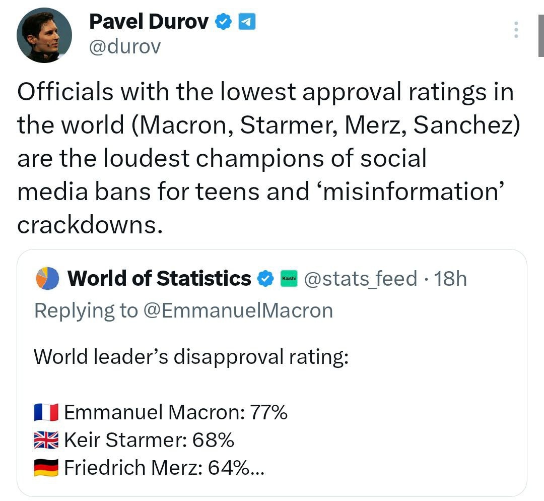 Telegram CEO spots link between low approval ratings and desire for social media CRACKDOWNS