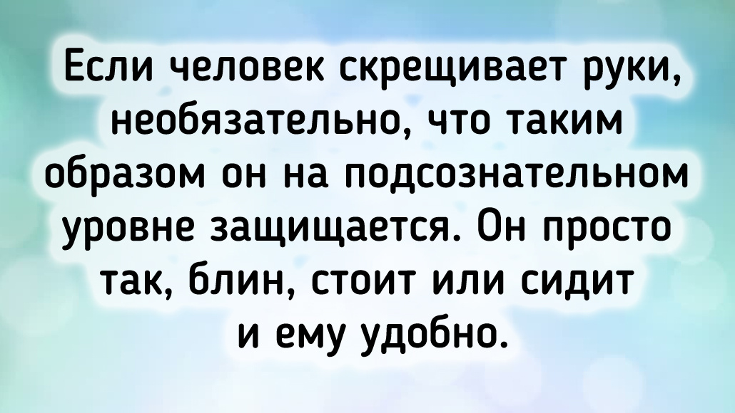 - Если человек скрещивает руки, необязательно, что таким образом он на подсознательном уровне защищается. Он просто так, блин, стоит или сидит и ему удобно.