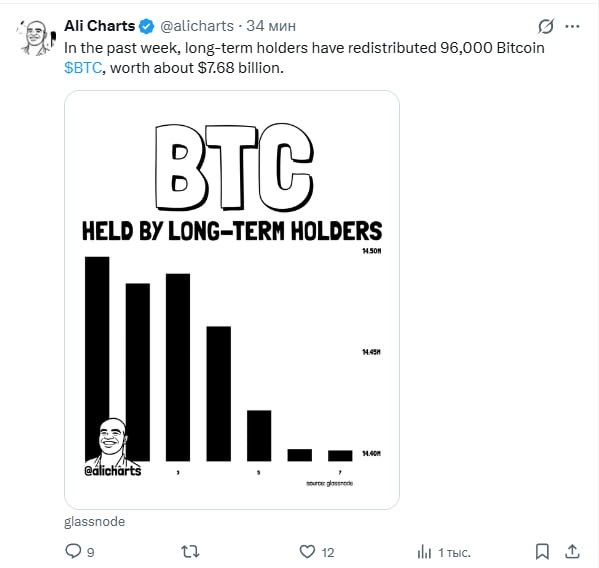 За прошедшую неделю долгосрочные держатели перераспределили 96 000 биткоинов на сумму около $7,68 млрд.