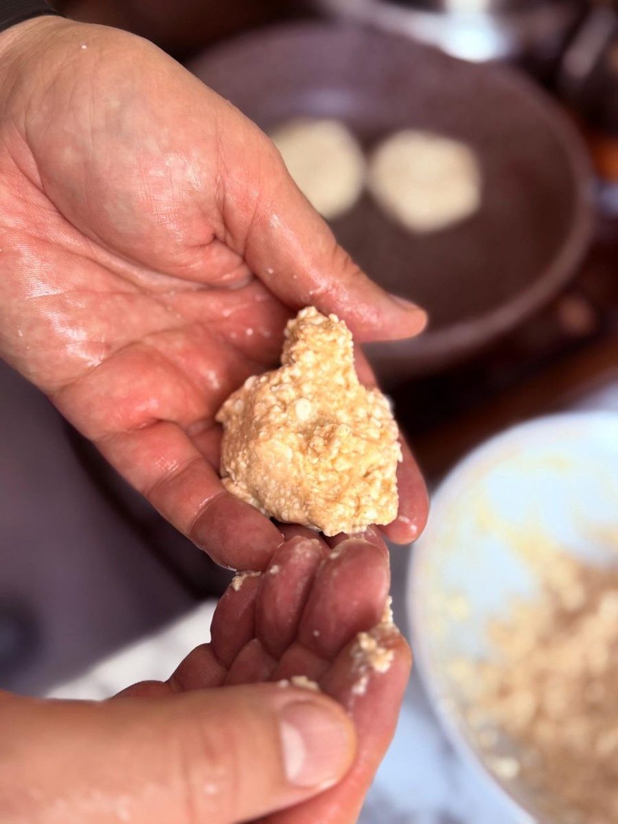 : 1. 450 гр нежирного творога отжать, если слишком влажный. 2. Два яйца 3. Порция сывороточного протеина 4. Соль и ванилин 5. Три столовых ложки цельно зерновой муки Готовая смесь должна не разваливаться и лепиться в шарики. Обжарить в небольшом количестве масла по 2-3 минуты с каждой стороны. Подавать с греческим йогуртом и медом. В одной порции 40 гр протеина и 2.5 гр клетчатки. Приятного аппетита!