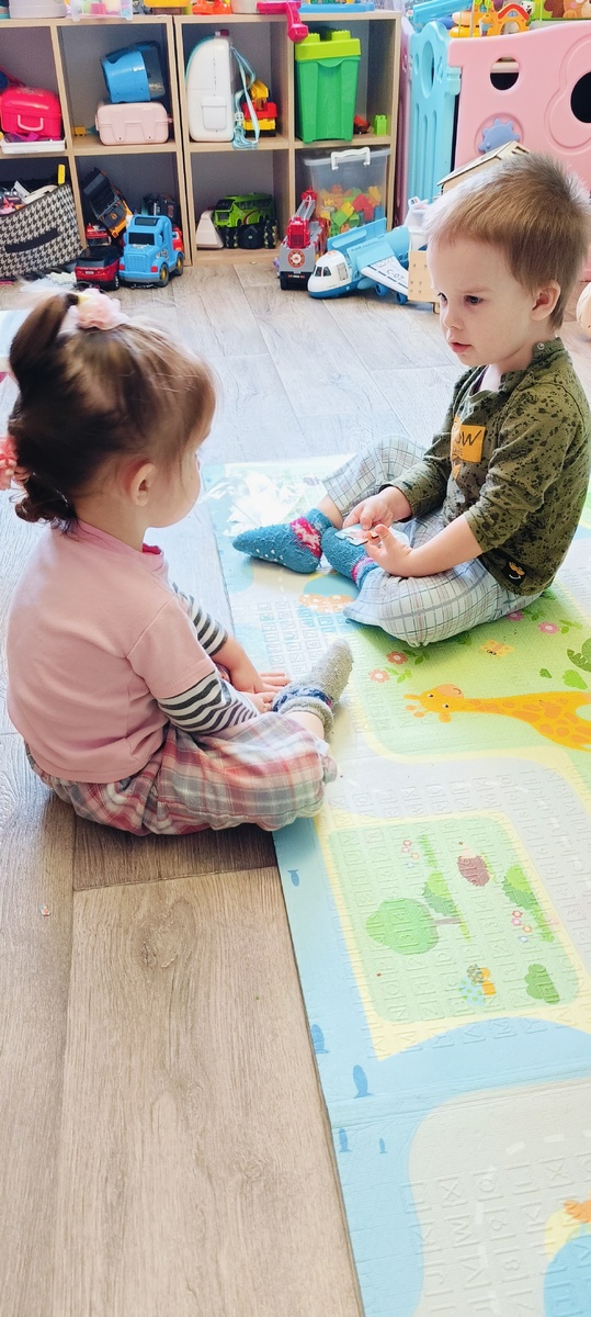 Самое интересное, что Сева практически всегда следует туда, куда она его зовет, и включается в Амелькину игру. Но этот домик маловат для двоих, Сева никак не протиснется. Амелия встала, еще стол отодвинула, расширила границы, заходи, говорит.