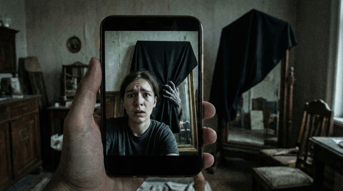 Я поднял телефон. Включил фронтальную камеру. На экране появилось мое лицо — бледное, с темными кругами под глазами. За моей спиной возвышался черный прямоугольник завешенного зеркала.