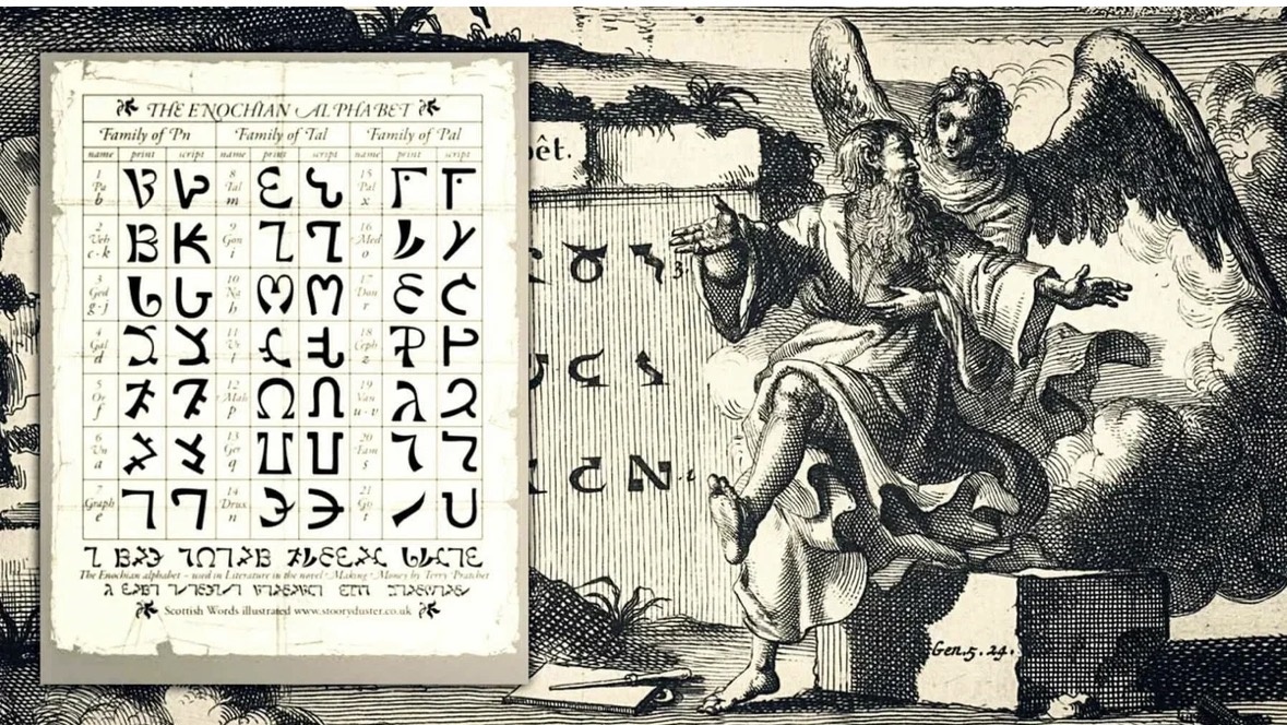 · Енохианский язык: Собственный алфавит, грамматика и синтаксис. Ди считал его «адамическим языком», на котором говорили до Вавилонского столпотворения.