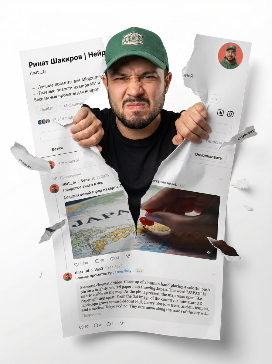 ✔️ Инструкция: Для этого заходим в VeoSeeBot или на сайт, выбираем "Работа с изображениям", Nano Banana Pro и пишем промпт ниже: Очень креативное цифровое произведение искусства, где реалистичная парень (лицо которого 100% повторяет прикрепленную первую фотографию) драматично рвёт страницу профиля в социальных сетях Telegram. Профиль threads выглядит как бумага или экран, который разрывается, с разорванными краями и летающими фрагментами. Парень наполовину находится вне рамки профиля, одной рукой раздвигает страницу, выражение лица напряжённое, но уверенное. Его лицо должно точно совпадать с изображением парня, без изменений из прикрепленной первой фотографии. Фон профиля Telegram должен точно совпадать с предоставленным изображением профиля из второй фотографии. Динамическое освещение, кинематографическая глубина, ультрареалистичные детали, чёткий фокус, современная эстетика, белый или мягкий градиентный фон, высокое качество, 4K, трендовый цифровой художественный стиль. ❤ Примерами