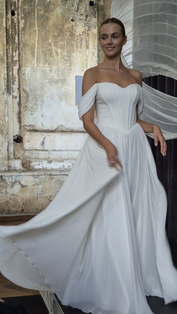 Молочный атлас и невесомый креп-шифон создают образ, наполненный мягким сиянием и лёгкостью. А-силуэт мягко струится от линии талии, а фигурный корсет со шнуровкой подчёркивает изящный изгиб. ✨ Особенности модели: • Корсет с фигурным вырезом и шнуровкой — утончённая посадка и акцент на талии. • Съёмные рукава-крылышки из креп-шифона — можно создать два разных образа: романтичный с драпированными рукавами или сдержанный без них. • Лёгкая шифоновая юбка — парит при каждом движении, сохраняя торжественный объём. 💫 Найдите свой идеальный силуэт! Платье доступно для примерки в 46 и 48 размерах. #свадебноеплатье #невеста2026 #асилуэт #корсет #съемныерукава #шифон #атлас