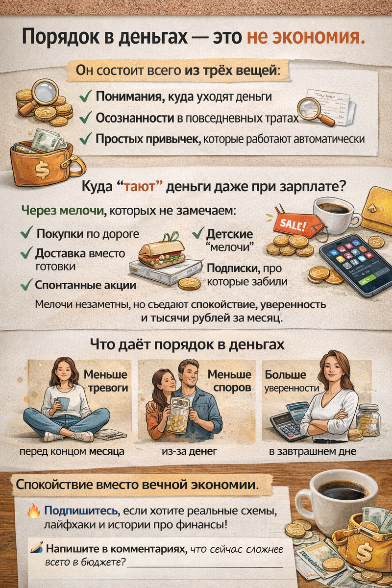 Экономия — слово, которое многих пугает. Сразу представляются ограничения, запреты и постоянный стресс. Но правда в том, что порядок в деньгах — это не экономия. Это совсем про другое. На деле он состоит всего из трёх вещей: Не нужно становиться «идеальным бухгалтером». Не нужны сложные таблицы и финансовые термины. Достаточно перестать терять деньги вслепую. Большинство семей не живут на широкую ногу, они не тратят «лишнего» специально. Но деньги уходят через мелкие, незаметные дыры: Каждая из них кажется незначительной, но вместе они съедают спокойствие и уверенность. Когда вы: Происходит важный сдвиг. Вы перестаёте: И начинаете: Даже если доход не вырос. Порядок в деньгах — это не «ничего себе не позволять».