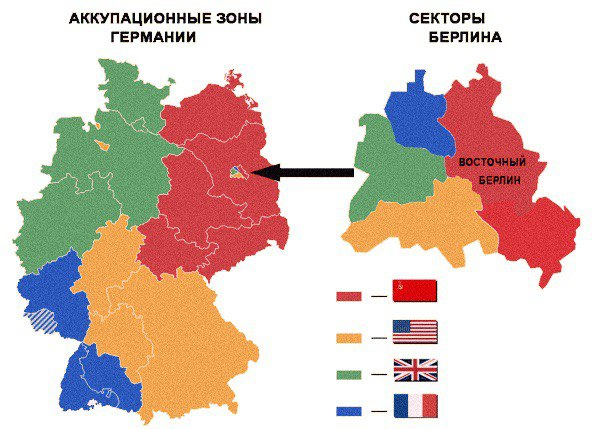 Аналогично был разделен Берлин, но тут была своя специфика — столица Германии находилась прямо посреди советской зоны оккупации, позже — ГДР.