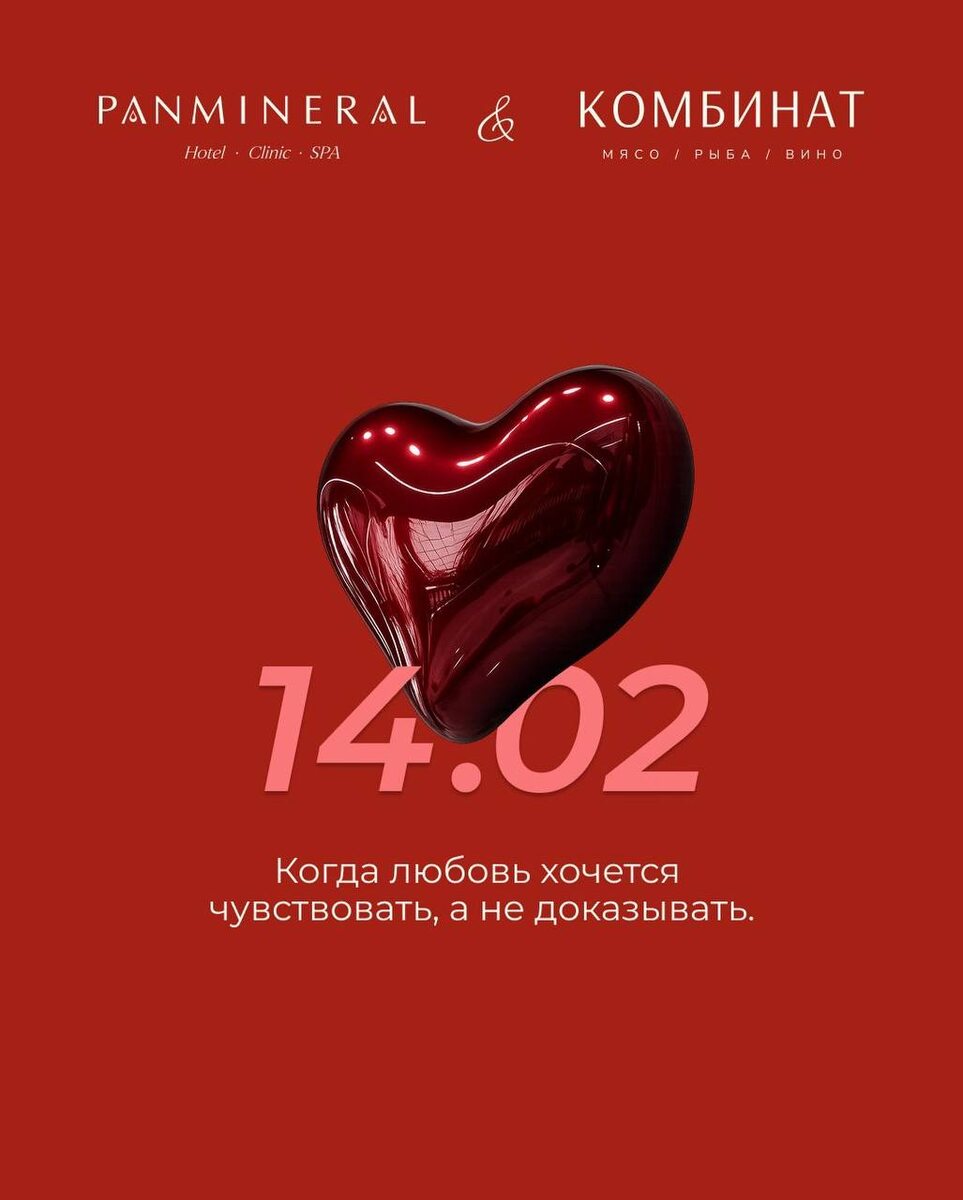 Комбинат и PANMINERAL приготовили для вас особенный сюрприз. Закажите специальный валентиновский десерт «Влюблённое сердце» - и автоматически станьте участником розыгрыша главного приза. Главный приз - посещение акватермального комплекса PANMINERAL для двоих. Тишина, тёплая вода и отдых только для вас. Без подарка не останется никто. Каждый гость получает скидку от 20% на самые популярные процедуры комплекса. Просто десерт - и больше, чем просто вечер. Все подробности в карусели.
