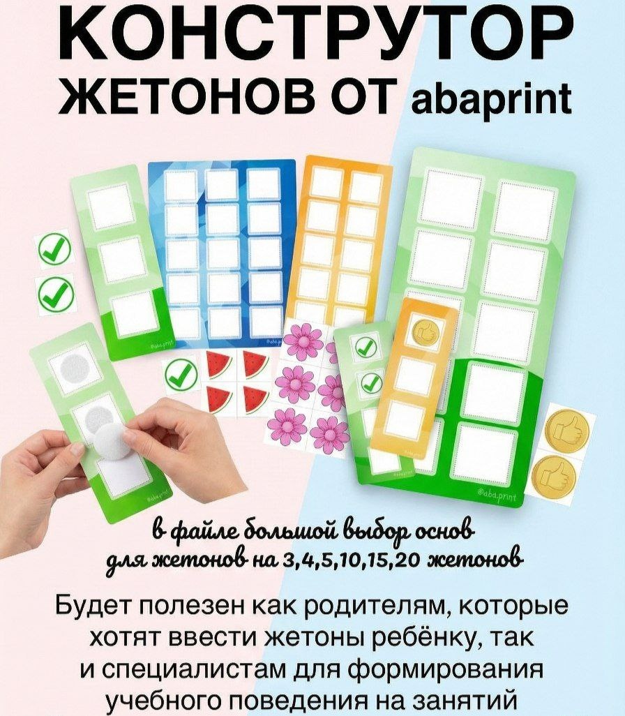 🔥 Конструктор жетонов + Протокол ввода системы подкрепления 💡 🎁 Теперь всего за 399 ₽ вместо 699 ₽! ✨ Что вы получаете? ✅ Гибкий конструктор жетонов: — Основы на 3, 4, 5, 10, 15 и 20 жетонов — 17 уникальных дизайнов жетонов — Разнообразие цветов и форм 🎨 Соберите персональный набор под запросы вашего ребёнка: выберите основу и подберите любимые жетоны вместе! 📘 БОНУС: В комплекте — готовый ПРОТОКОЛ ввода жетонной системы! Идеально подойдёт и родителям, и специалистам (ABA-терапевтам, педагогам, дефектологам) для формирования учебного поведения. 🖨️ Файл в PDF — сразу после оплаты! Распечатал → вырезал → начал работать! 👉 Успейте по спеццене! 🔗 Забрать конструктор за 399 ₽ https://abaprint.ru/o/6009ad/