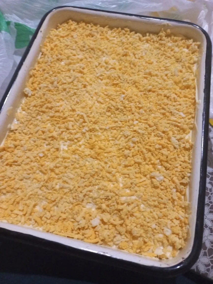 Сверху яичными желтками посыпала, а белок уже в самом салате был.