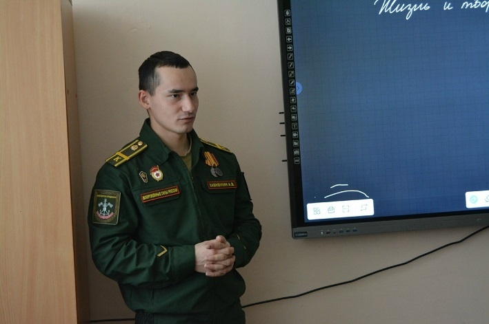 Участник СВО Алик Хабибуллин пришел пообщаться со студентами и педагогами Уфимского училища искусств, выпускником которого является и сам. Алик Хабибуллин окончил училище в 2023 году, а сегодня он курсант Военной инженерной академии имени Героя Советского Союза генерала-лейтенанта Д.М. Карбышева. За мужество, проявленное в зоне СВО, награжден медалью «За боевые отличия». Приехав домой в отпуск, он нашел время навестить свою альма-матер. Для студентов эта встреча стала настоящим уроком мужества, отметили в училище искусств. Молодой солдат рассказал им о своем жизненном пути, о том, почему выбрал военную стезю, и ответил на заданные вопросы. Фото: Уфимское училище искусств.