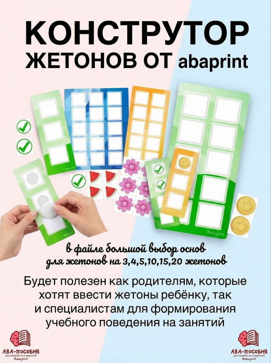 🔥 Конструктор жетонов + Протокол ввода системы подкрепления 💡 🎁 Теперь всего за 399 ₽ вместо 699 ₽! ✨ Что вы получаете? ✅ Гибкий конструктор жетонов: — Основы на 3, 4, 5, 10, 15 и 20 жетонов — 17 уникальных дизайнов жетонов — Разнообразие цветов и форм 🎨 Соберите персональный набор под запросы вашего ребёнка: выберите основу и подберите любимые жетоны вместе! 📘 БОНУС: В комплекте — готовый ПРОТОКОЛ ввода жетонной системы! Идеально подойдёт и родителям, и специалистам (ABA-терапевтам, педагогам, дефектологам) для формирования учебного поведения. 🖨️ Файл в PDF — сразу после оплаты! Распечатал → вырезал → начал работать! 👉 Успейте по спеццене! 🔗 Забрать конструктор за 399 ₽ https://abaprint.ru/o/6009ad/