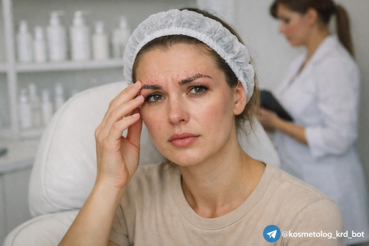 Вторая проблема — контакт с кожей. При Soap Brows мастер буквально «приклеивает» волоски к коже лба воском или гелем, а потом наносит состав. Если он попадает на кожу, начинается раздражение: сначала лёгкое покраснение, потом мелкая сыпь, зуд. У клиенток с чувствительной кожей реакция может быть моментальной — прямо в кресле появляются красные пятна. И вот здесь начинается самое неприятное: девушка приходит домой, видит в зеркале красноту, мажет её тональником, чтобы скрыть, а под ним кожа не дышит и воспаление усиливается. Через три дня она уже боится умываться, потому что каждое прикосновение — болезненное.