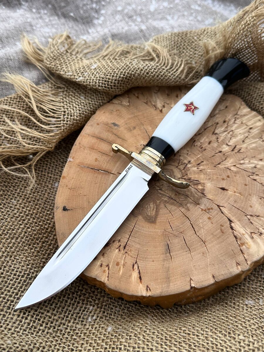 ! 🔥 ✨ *Эксклюзив от нашей мастерской — нож, сочетающий исторический характер и современные технологии!* Клинок — из нержавеющей порошковой стали Elmax 🗡️ *Прочность на излом и отличная стойкость к заточке!* Твердость — 62 HRC, заточка «в бритву» для максимальной остроты. Рукоять — из белого и чёрного акрила с инкрустацией Красной звезды. 💎 *Яркая деталь для коллекционеров и ценителей уникальных вещей!* В комплекте: ножны из натуральной кожи (Можем сделать формованные ножны — +8 000 руб.) Акционная цена — 12.000 руб. _Обычная цена — 19.943 руб._ 📲 Для заказа пишите в Telegram: [@Nazarklinokbot](https://t.me/Nazarklinokbot) Или WhatsApp/Viber: [ +79101343831](https://wa.me/79101343831) #нож #финка #КузницаНазарова #ручнаяработа #Elmax #акция #подарок #коллекция #охота #туризм