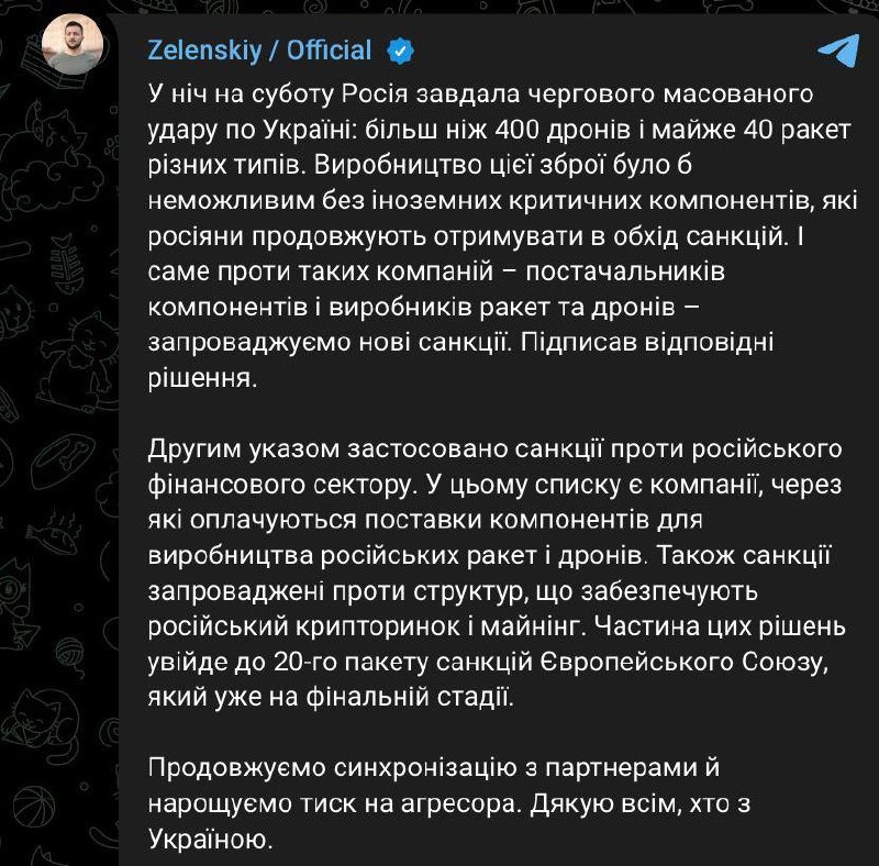 Зеленский ввел санкции против зарубежных компаний, поставляющих компоненты для ракет и дронов в РФ