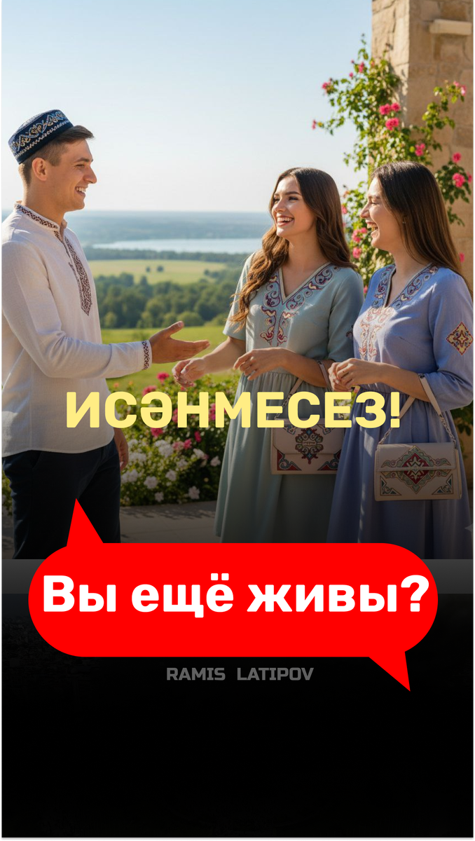 Татарское приветствие очень необычное. «Исәнмесез» при дословном переводе означает: «Вы ещё живы?» Смысл такой: «Ты ещё не умер?» А если обращаются к ровеснику — «исәнме» — «ты ещё живой?» Слова приветствия народа — это отражение его образа жизни. Они дошли до современного общения из истории и древних культур. Это постоянно употребляемые слова, краткая формула того, чего больше всего не хватает в жизни этого народа. Русские говорят «здравствуйте», то есть «будьте в здравии». Англичане, помимо hello («хэлóу»), говорят How do you do? («хау ду ю ду») — буквально «как вы делаете?», то есть интересуются, чем занимается человек. Французы и немцы желают хорошего дня:
