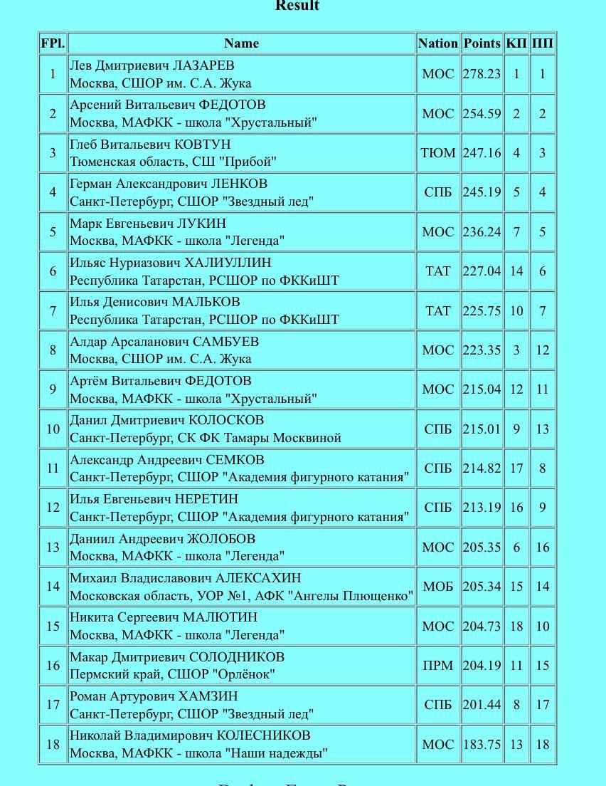 Саранск Юноши 1. #Лев_Лазарев - 278,23 баллов; 2. #Арсений_Федотов - 254,59 баллов; 3. #Глеб_Ковтун - 247,16 баллов. Результаты Детализация оценок КП Детализация оценок ПП Лев Лазарев выиграл Первенство России во второй раз! #саранск #Первенство_России #юниоры