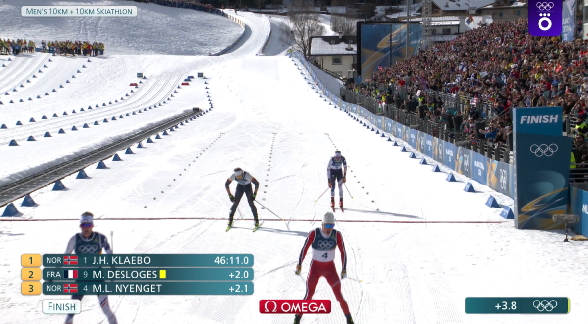 Йоханнес Хёсфлот Клебо не дал никому шанса усомниться в своём превосходстве: норвежец уверенно выиграл мужской скиатлон 20 км (2×10 км) на Олимпийских играх в Италии. Но победа далась в упорной борьбе — француз Матиас Делож и ещё один норвежец Мартин Лёвстрём Нюэнгет финишировали в двух секундах, а россиянин Савелий Коростелёв до последних метров претендовал на бронзу.