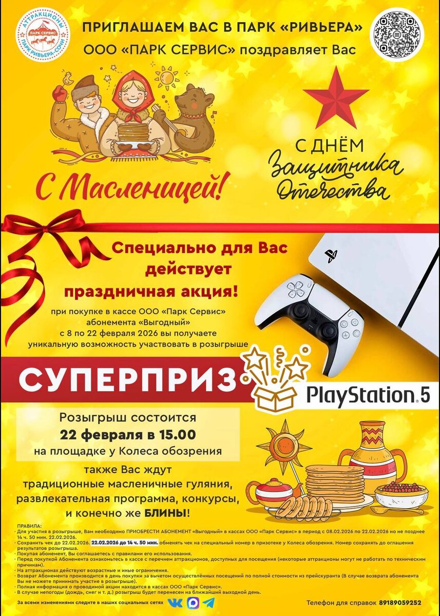 »! 🎉 Приглашаем вас на яркие масленичные гуляния в парк «Ривьера» — с атмосферой настоящего праздника, конкурсами, развлечениями и, конечно же, румяными блинами! ✨ Специально для вас — праздничная акция: С 8 по 22 февраля 2026 года при покупке абонемента «Выгодный» — в кассах парка — или онлайн на нашем сайте https://park-riviera.ru/tickets/ вы получаете уникальную возможность принять участие в розыгрыше СУПЕРПРИЗА — PlayStation 5 🎮 📍 Розыгрыш состоится: 🗓 22 февраля ⏰ в 15:00 📌 на площадке у Колеса обозрения В программе дня: — традиционные масленичные гуляния — развлекательная программа — конкурсы — и, конечно же, блины 🥞 Приходите всей семьёй, покупайте абонемент удобным способом и встречайте Масленицу ярко, весело и с шансом на главный приз! 💛 📞 Телефон для справок: 8 (918) 905-92-52