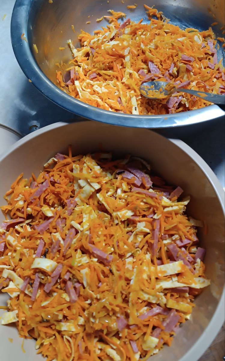 ». Если уж начала — значит будет тазик. Угостили нас морковкой… и тут потянуло в воспоминание - в студенчество, захотелось сделать легендарный салат «Мао Цзэдун»😁. Очень часто его брали в кулинарии после пар. Название грозное. Ингредиенты - максимально народные: 🥕 корейская морковь 🥚 яичные блинчики 🧅 жареный лук 🥩 колбаса салями 🥄 майонез — по желанию (лично мне и без него жирновато, но традиции уважаем 😄) на фото пока без майонеза. А вы готовили такой салат и как он назывался у вас? 🤔 Рецептом как приготовить корейскую морковь делилась ранее. Тëрка у меня уже на последнем издыхании🙈, если поделитесь артикулом (ВБ, Озон) на хорошую тëрку для корейской моркови буду благодарна❤️
