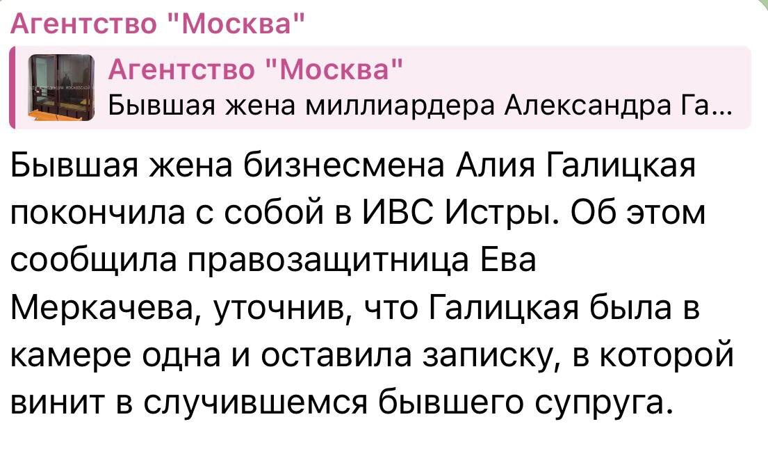 Ужас какой. Ранее СМИ писали, что она подала иск о разделе имущества — в том числе большой квартиры на Патриарших с двумя машино-местами. Но по заявлению мужа о вымогательстве ее задержали и поместили в тюрьму