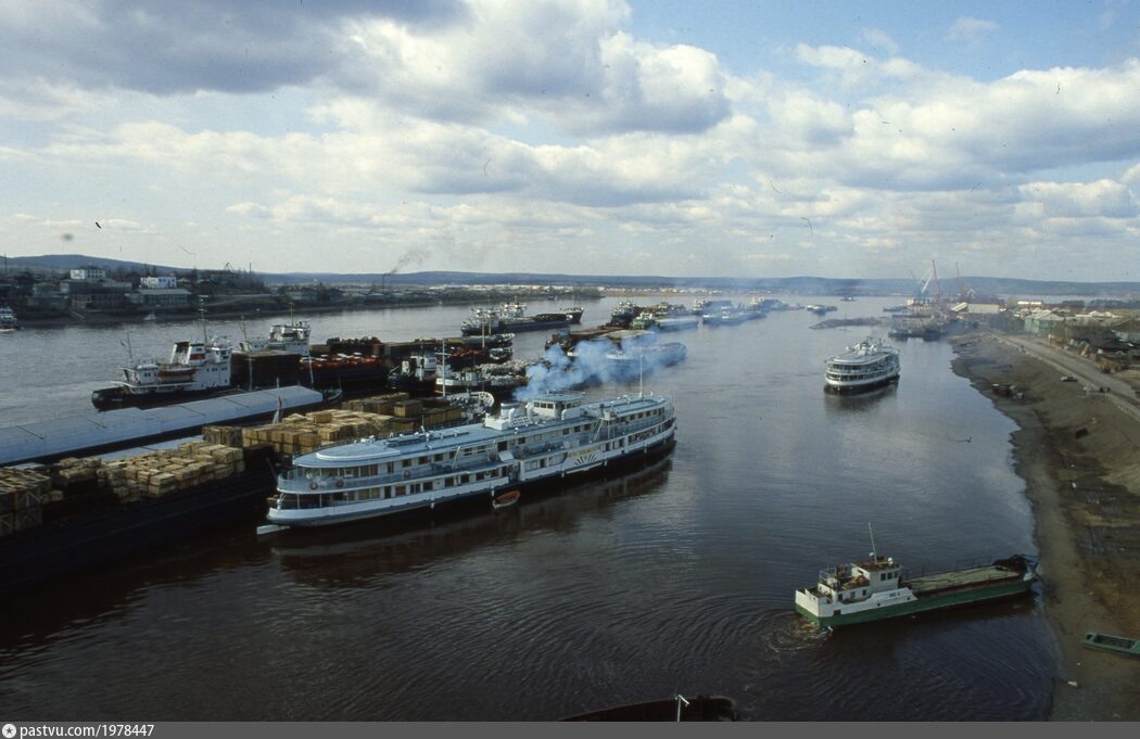 На переднем плане пароход 737-го проекта "Благовещенск" - наверное последний речной пассажирский пароход СССР.Где-то тут сейчас и гниёт, если слухи нам не врут... ((Чуть правее - имхо его близнец "Красноярск"... 📍 Киренск, Россия 📅 Примерно 1987 год 📱 Мы в ВК #ИсторияФлота #PastVu